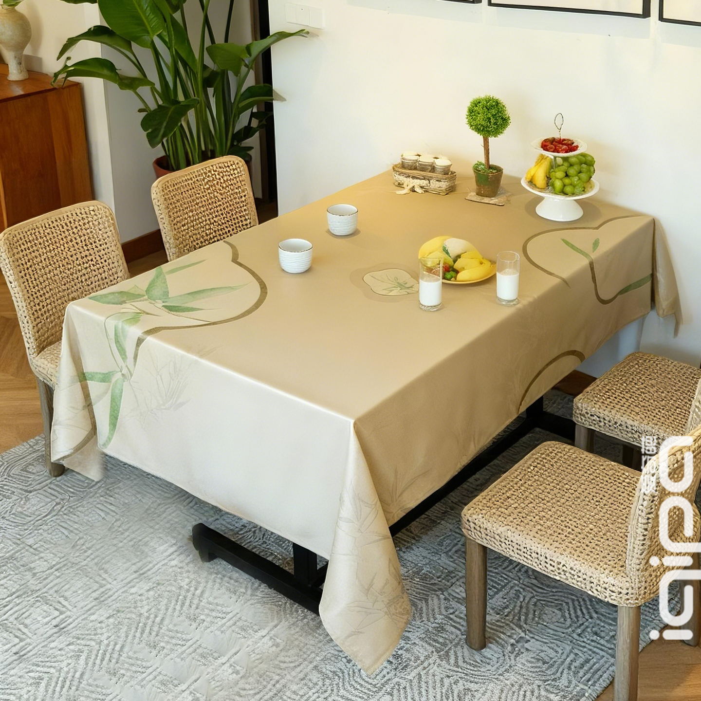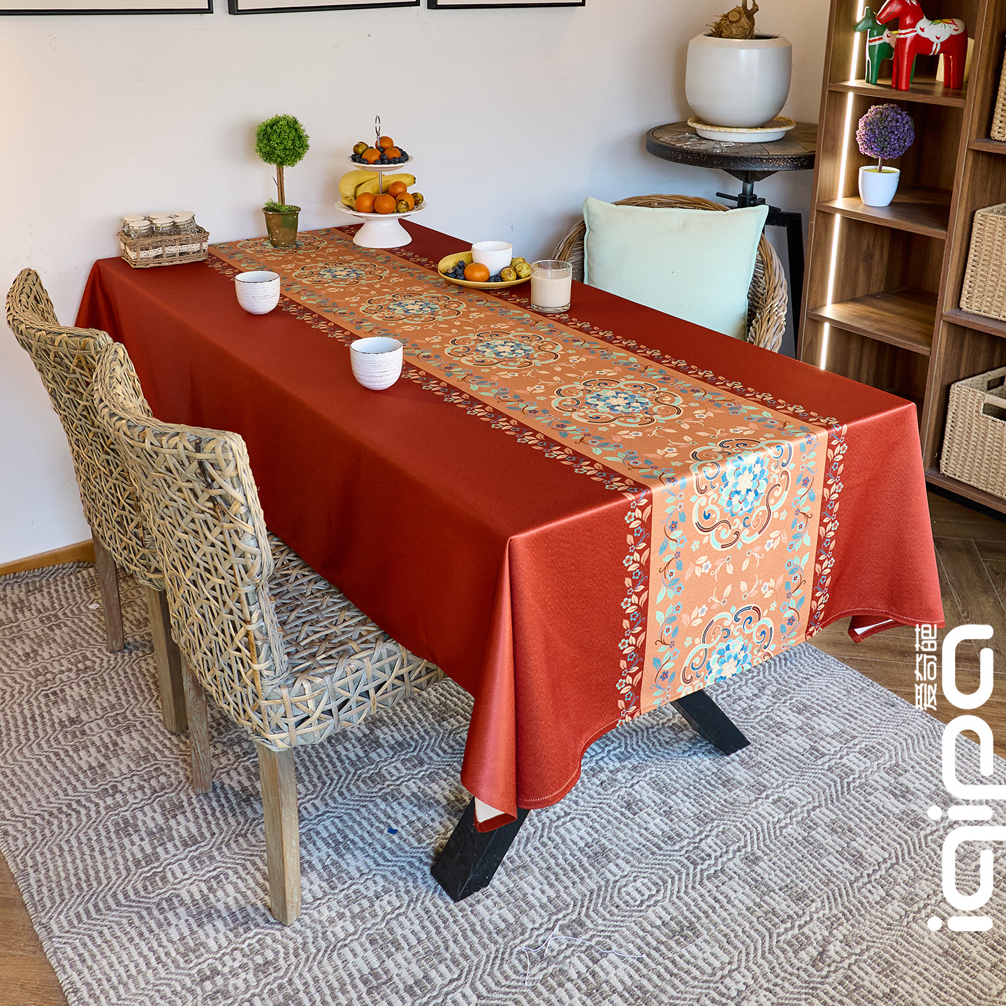 看到这张桌布时,直接被这抹「朱红灿金」撞中了。朱红底衬得客厅暖透,灿金纹又偷着贵气,往餐桌一铺,连果盘都沾了「龙凤呈祥」的祥瑞。这张桌布往那儿一放,三餐四季都裹着吉庆;是摆上茶点时,纹样里漫出来的不是老气,是新中式的轻贵松弛。承继了「龙凤呈祥」的祥瑞意…