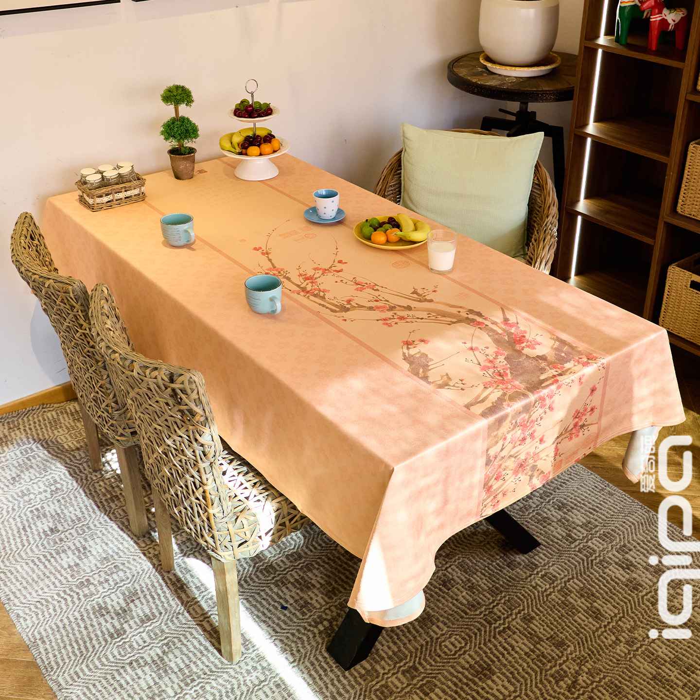 当明代姚绶《红梅图》的笔墨意趣邂逅日常餐桌,「梅花图」桌布便将千年春韵藏进了烟火里。设计取法明代点梅妙笔,朱红花瓣晕染出报春意象,底纹以粉色梅花缀饰,暗合 “梅开五福” 的祥瑞寓意,既承国画留白之雅,又融民间祈福之愿。暖调底色衬着疏影横斜,铺展于餐桌,三…