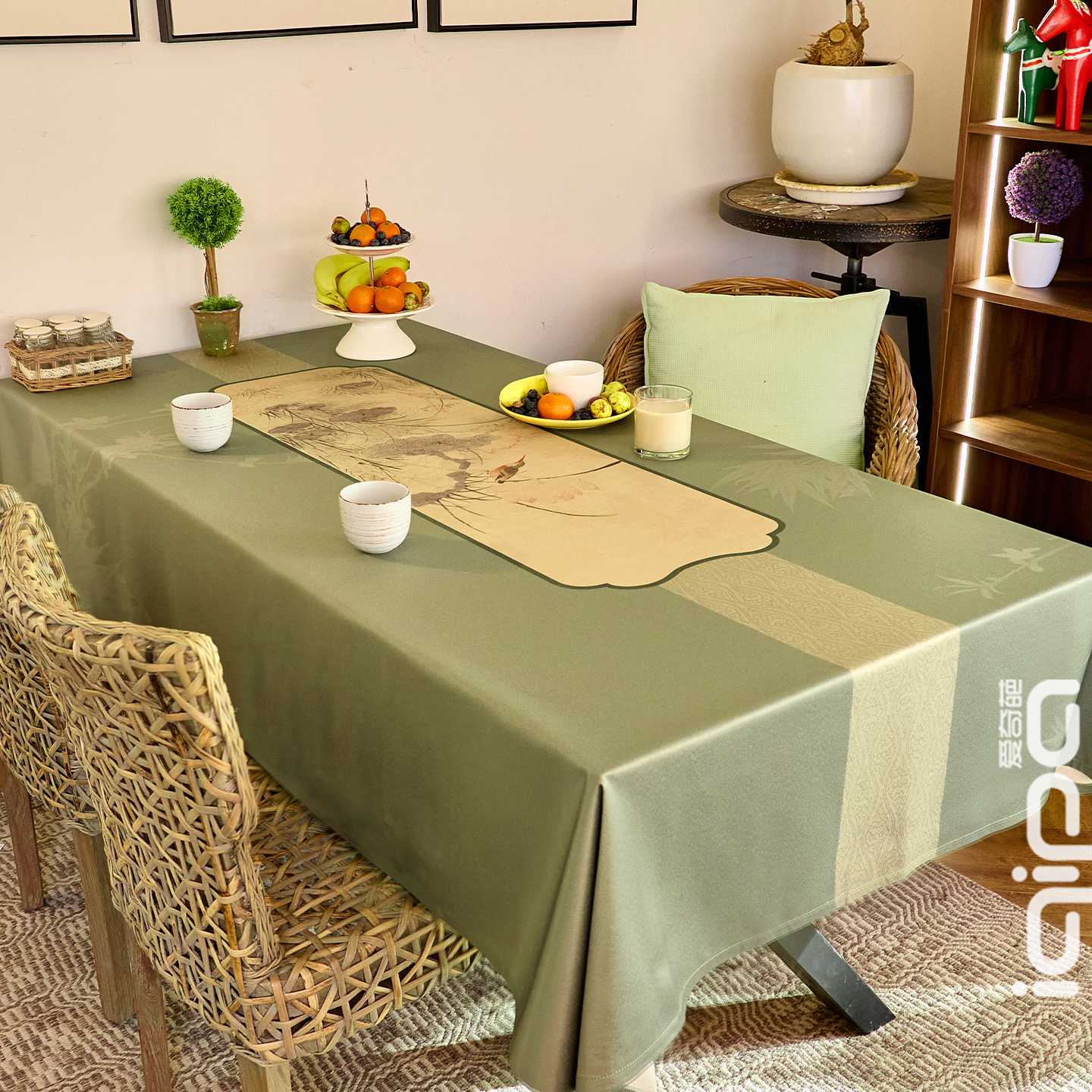当我们在博物馆里对着“水面闻香轴”流连忘返时,或许从未想过,,宋画里的雅致,能成为餐桌上的日常这款桌布直接取法古画《水面闻香轴》,用浅墨复刻了原作 “汀洲幽禽、淡墨荷草” 的淡远笔触,把宋画里的留白与雅致,完整呈现在布料之上。边缘点缀的淡竹暗纹与画框式回…
