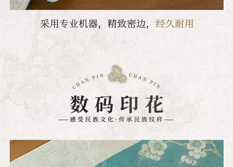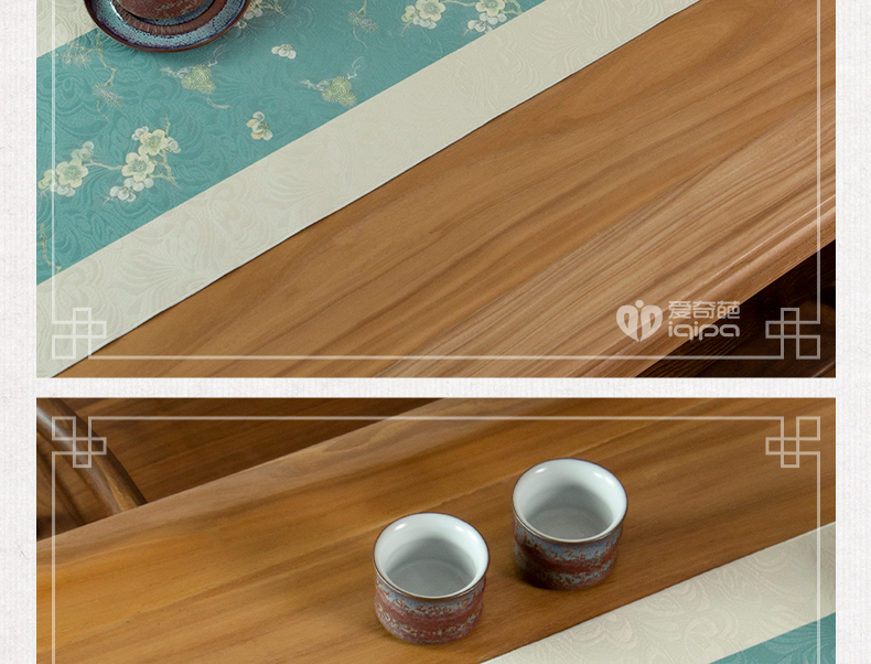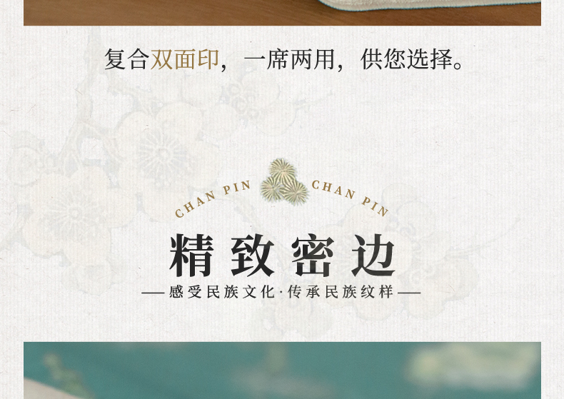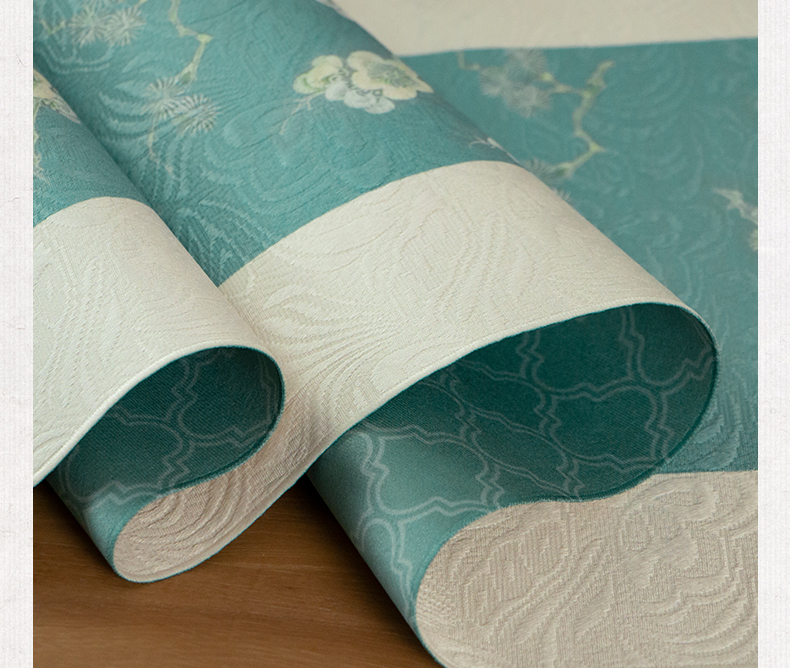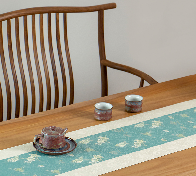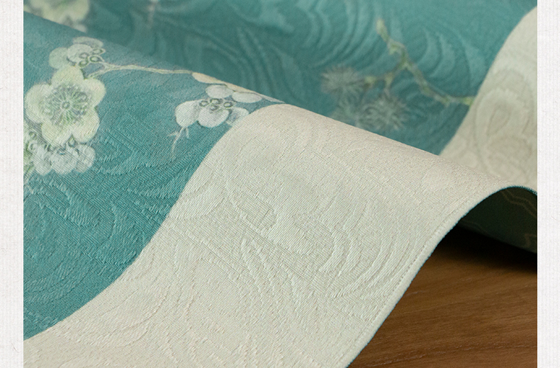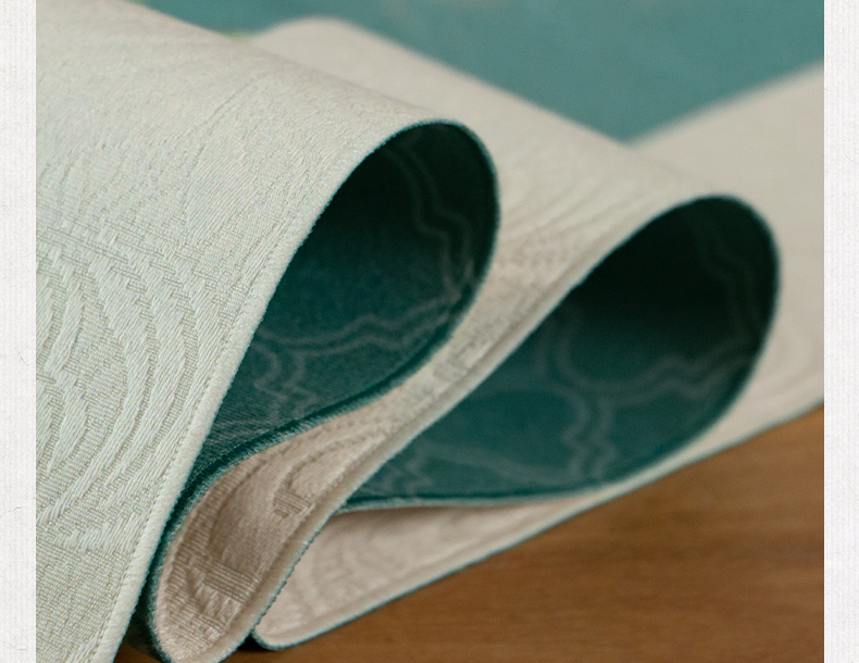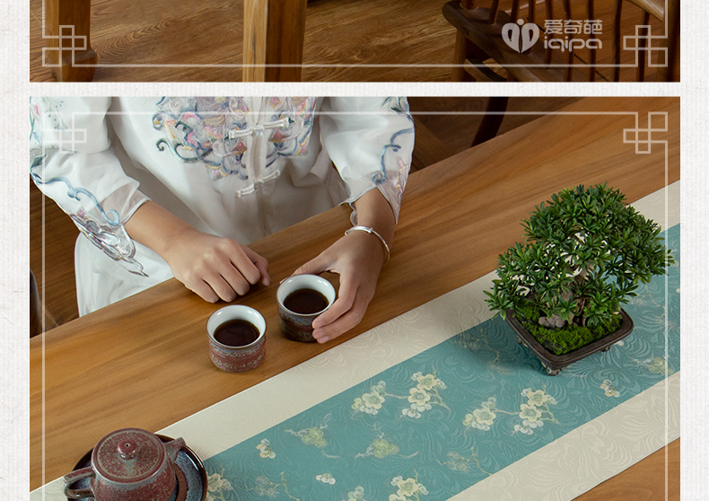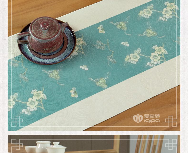 爱奇葩开发的松梅纹茶席,采用织锦缎提花面料,背面复合毛绒材质,能够有效做到防水防滑。