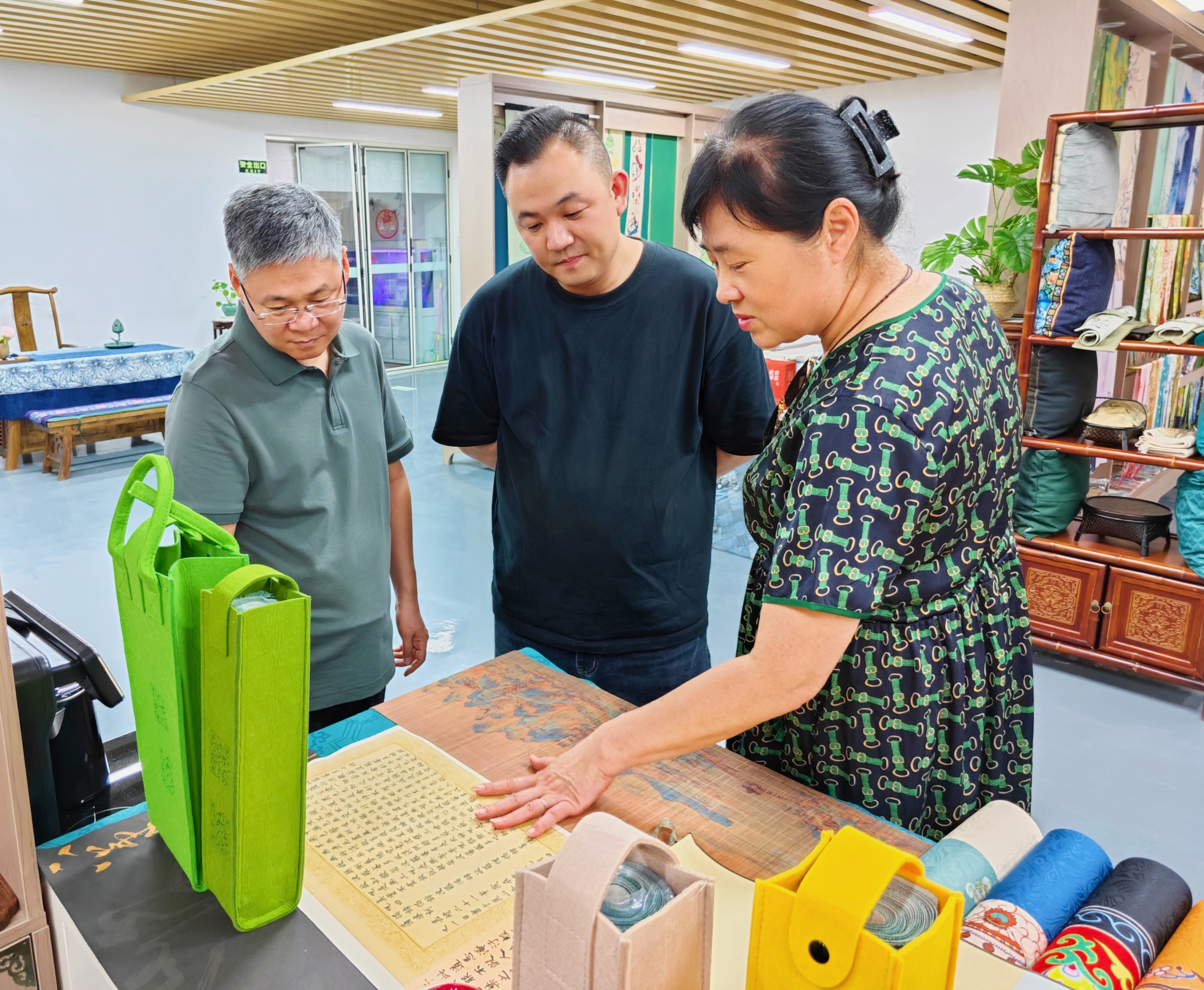 7月20日下午,市人大常委会党组副书记、副主任蔡红,高新区人大工委原主任、二级巡视员张良才一行来到爱奇葩开展调研,对爱奇葩文创产业的发展给予了充分的肯定。蔡红副主任和张良才巡视员一行参观了爱奇葩的文化展厅,展厅内古色古香的茶席、抱枕、帆布包、丝巾、颜料包…